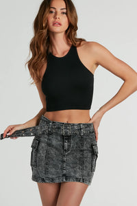 Embark as a trendsetter in this denim mini skirt for casual plans or coffee shop hangs! The mid-rise waist with an adjustable belt provides the perfect fit, while the cargo flap pockets add a touch of utility and style. The bodycon silhouette and mini-length hem in acid-wash denim fabric give major 90s vibes. Complete the look in a tee, a cropped jacket, and lug boots for an edgy vibe!