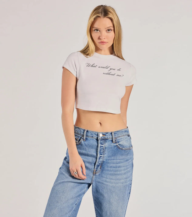 Keep it cheeky in the what would you do without me graphic t-shirt top. With a sassy script and comfy cotton fit, this cropped tee is your new go-to for effortless vibes.